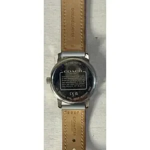 Coach Grand, style number 14503973 — cool silver dial meets rich blue leather strap, all packed into a sleek 36 mm stainless steel case. Crystal hour markers add just enough glint without overdoing it. Quartz accuracy, mineral glass, and 3 ATM water resistance. Quiet elegance that works from beach runs to boardroom turns. Modern, refined, and built to move.