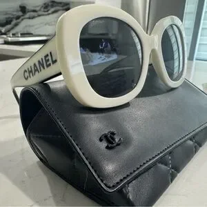 Stylish CHANEL sunglasses in cream. Bold design with iconic branding. Perfect for a sophisticated look.