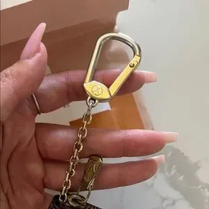 Elegant key pouch with iconic checkered design. Features a gold-tone keychain clip.
