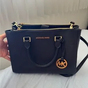 Chic Michael Kors satchel in black. Features gold-tone hardware and logo charm. Perfect for everyday elegance.