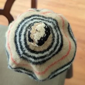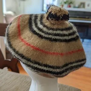 Stylish Burberry beret with classic stripes. Features a pom-pom on top. Perfect for a chic look.