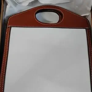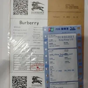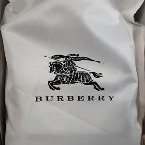 Stylish Burberry tote in tan and white. Features bold logo and elegant design.