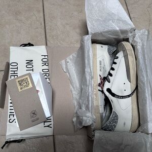 A timeless icon yet one that’s constantly evolving. At Golden, we love taking our classics and reworking them all the time, always from a new angle. This model with white leather upper features a crystal star with beige and brown leopard print and a silver-colored Swarovski crystal heel tab. The dove-gray suede tongue and black laces with contrasting white logo add the finishing touches.