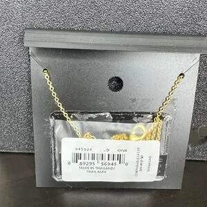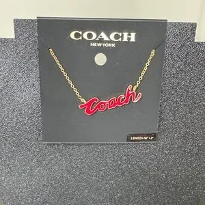 Chic Coach necklace with a bold red script pendant. Gold chain adds elegance.