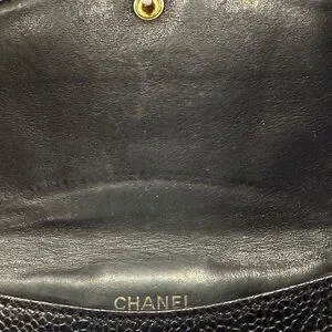 Elegant black leather wallet with iconic Chanel logo. Perfect for a stylish touch. Chanel Caviar Skin compact wallet. Preowned condition. See pics for callouts. 100% authentic. Includes authenticity card.