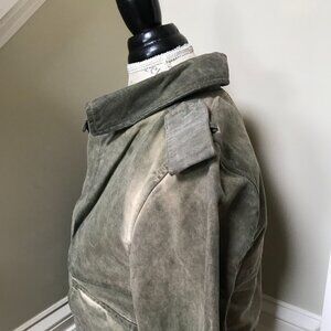 Women's Golden Goose Moto / Utility Jacket in a size XS. Solid green color with a zip front and button closure. A lived in, vintage look. Faint Mark when all buttons are closed up to the neck (see pic) not that noticeable. Originally $695. Fast Same Day Shipping!