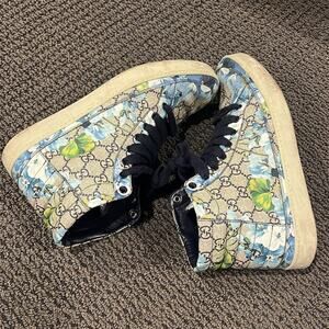 Experience the perfect blend of style and comfort with these Gucci high-top sneakers. Featuring a striking blue floral artistic design, these sneakers are crafted for those who appreciate unique fashion. The black laces and trim add a sleek touch, making them ideal for casual outings or making a bold statement. Fits like 10 - 10.5