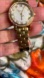 Stylish gold watch with Roman numeral markers, crystals around the opalescent face, and a brand new battery installed. Measures 7 inches around and comes with no extra links. Worn just a handful of times, there is not a scratch on it that I can find. EUC