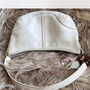 Stylish cream shoulder bag with pink and silver details. Perfect for any occasion. In good condition! Does not come with purse charm