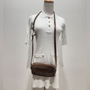 Stylish vintage Coach crossbody bag. Features signature pattern. Compact and versatile design.