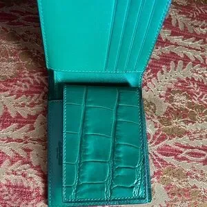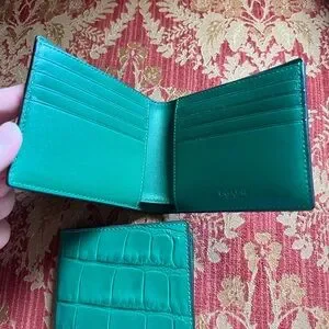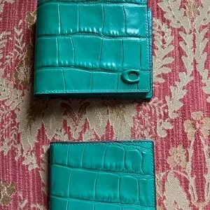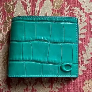 Stylish green Coach wallet, full wallet with removable fold cardholder with clear ID slot with crocodile embossing. Features a prominent 'C' logo. Excellent condition. Have copy of original emailed receipt which can be given happily upon request by buyer.