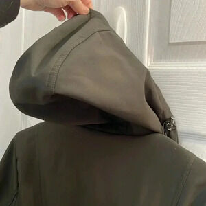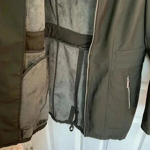 Fully fleece lined parka jacket with an adjustable cinched waist, zipper front pockets and adjustable slit on the back. The color is a slate gray.