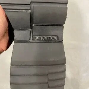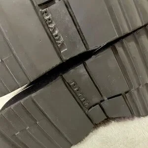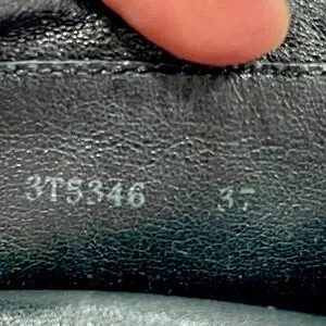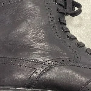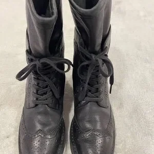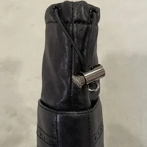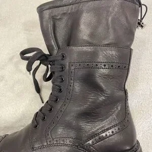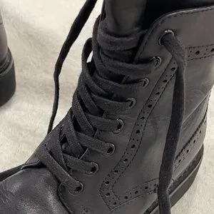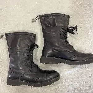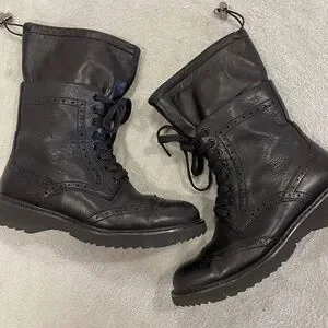 Black leather lace ups with soft inner leather lining with drawstring. Thick rubber sole with silver hardware.