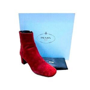 Prada Granato suede block heel ankle boots in deep maroon. ZIPPER SIDE CLOSURE. MAROON SUEDE PATTERN/DETAILING. Retail was $1690.00 . Comes with box . Size 41.