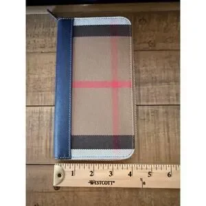 Burberry Wallet Womens Large Zip Around Dark Canvas Blue Check Leather Italy New