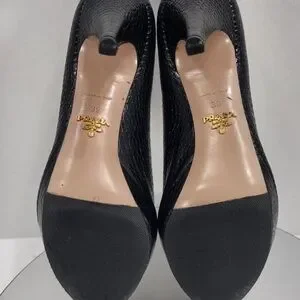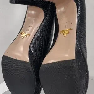 Step into elegance with these Prada black heels, featuring a sleek patent leather finish and a high stiletto heel. The classic peep-toe design adds a touch of sophistication, making them perfect for formal occasions.