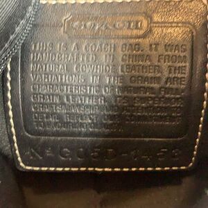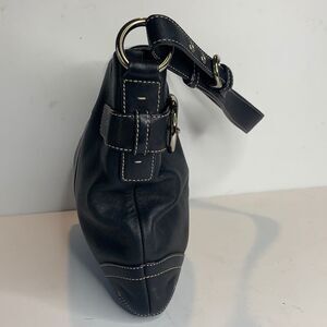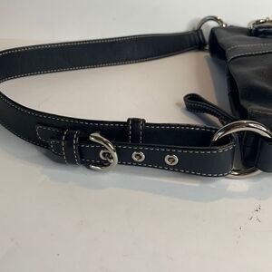 Coach soho black leather convertible bag with heavy contrast trim stitching and buckle straps on sides. Has top zip closure and silver tone hardware. Black canvas lining with zipper pocket and 2 slip pockets at interior walls. Adjustable leather strap with buckle that lengthens to crossbody strap. Excellent Condition