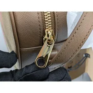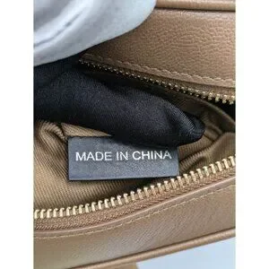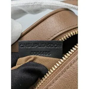 -Large fabric-lined interior, features side pouch pocket with stitched logo patch made of leather.