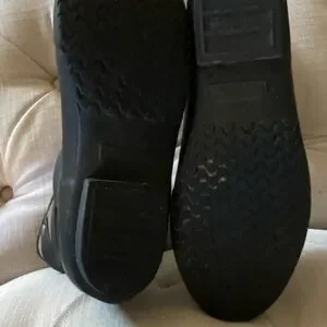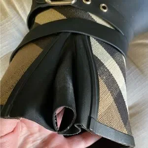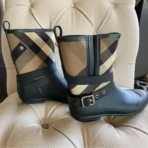 Stylish Burberry plaid rain boots with a buckle detail. Features black and tan colors.