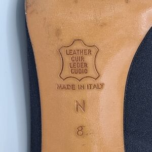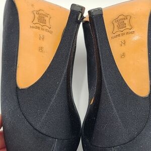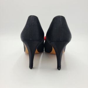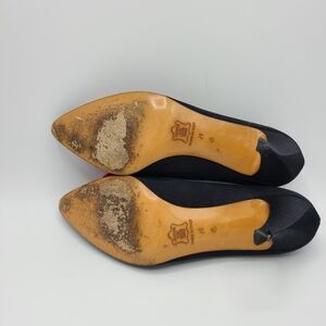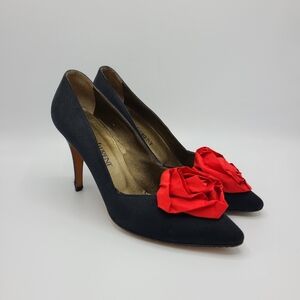 Yves Saint Laurent Vintage Black Matte Satin Red Rose Rosette Heels Pumps size 7 to 7.5. Black matte satin with red fabric rose rosette. Leather sole. Rounded pointed toe. Stiletto heel with beveled design. Made in Italy. Size 8 but is vintage sizing that runs a size smaller and fits size 7 to 7.5. There is a small tear at the bottom of one heel as pictured. Some wear on the bottom soles as pictured. Light discoloration on the inside as pictured and a small discoloration area in the middle of one of the roses as pictured. In overall very good vintage condition. Heel height: 3 3/4 in.
