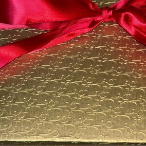 Vintage Dior Gold Gift Box with Red Ribbon and Red Tissue Paper