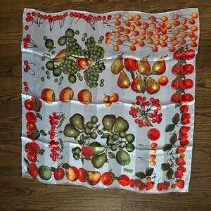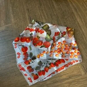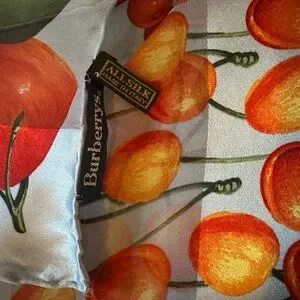 Elegant Burberry scarf with green and red fruit design. Adds a stylish touch to any ensemble.