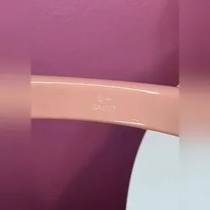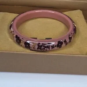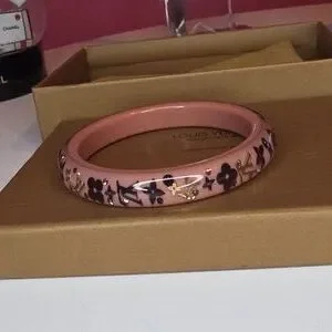 Full Inclusion! This is a beautiful and trendy Inclusion bangle bracelet from Louis Vuitton. The bracelet is made of a resin with small Swarovski crystals, tiny golden brass LV symbols, glittery LV flowers. The crystals and monogram elements appear to float in the clear resin finish. The base is a nude, blush type color and the crystals/flowers are a burgundy color.