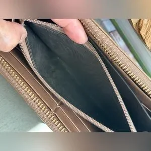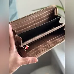 The interior coin po let zipper pull was missing but has been replaced with a. Ute heart shaped wing zipper pull.