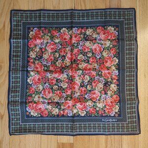 Never used Yves Saint Laurent small scarf / neckerchief. Beautiful floral pattern with. Tie at your neck or pair with your favorite neutral bag as a bag scarf! Seems like a cotton or cotton blend. 18" or thereabouts.