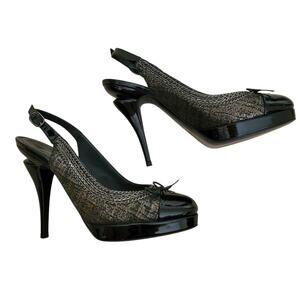 Chanel Vintage Platform Slingback Cap Toe Heels Logo CC Bow Leather 7 37.5