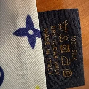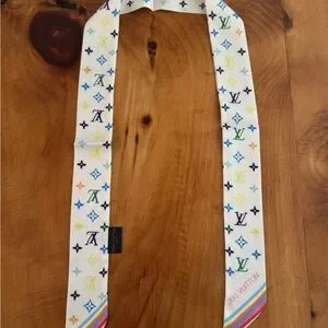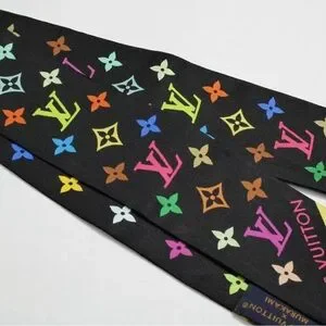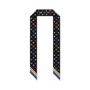 Chic Louis Vuitton scarf with vibrant monogram design. Perfect for adding flair to any look.