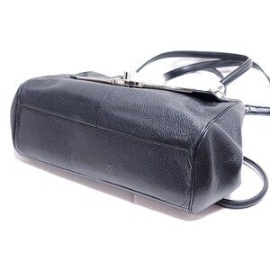 Features silver -tone hardware, front flap pocket, two flat leather top handles (7.5” drop) removable adjustable flat shoulder strap (22” drop) & top zipper closure. Interior of Handbag is lined in blue satin fabric with side zipper pocket and a patch pocket.