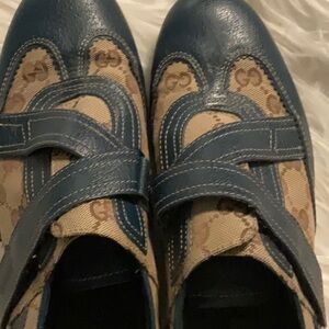Great condition! Chic Gucci sneakers with navy and beige monogram pattern. Ideal for everyday style.