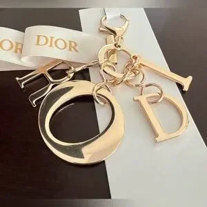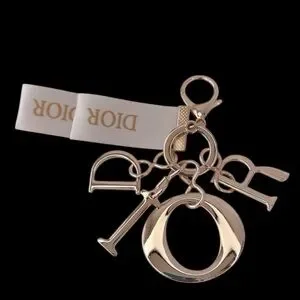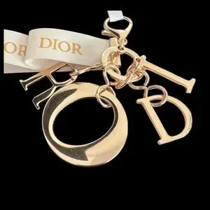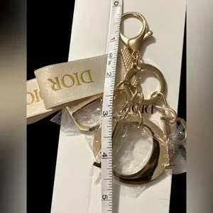 Chic Dior key holder with gold letters. Features elegant cream & gold ribbon detail.