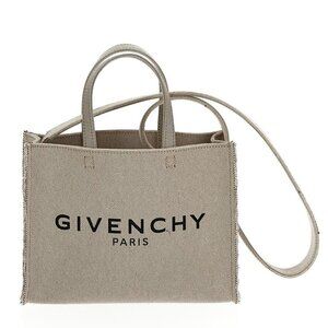 Givenchy small tote shopping bag in natural beige canvas with black logo and Paris printed on the front, top handles, tonal shoulder strap, a main compartment, an inner open pocket and ruined hems.