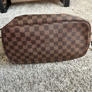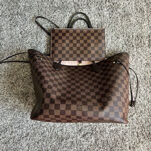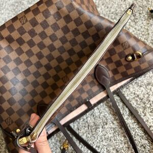 Minor flaws like dirty on the inside of the bag and on the zipper part of the pouch, white marks, some glue residue (I think) on the handle