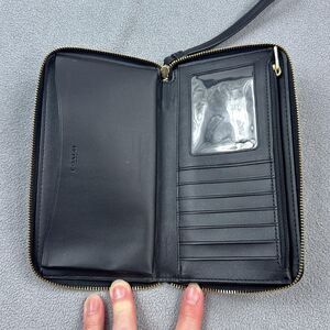 Excellent pre-owned condition. Exterior leather is clean with minimal handling wear; edges and corners intact. Interior is clean with no rips or stains observed. Zipper glides smoothly and wrist strap/hardware are secure. No major flaws noted.