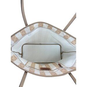 This Coach tote bag is designed with signature stripes in a sophisticated beige and white pattern. Crafted from durable canvas with leather handles, it offers a spacious interior for daily essentials. Suitable for both casual and professional settings, it combines style and practicality in a sleek design. NWT and authentic. No defects at all. SKU 9120