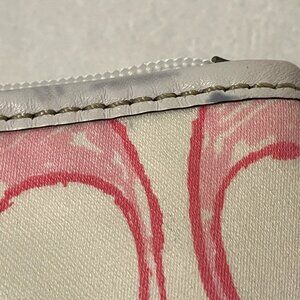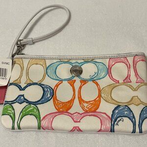 New with tags Coach Hampton Scribble Wristlet. Bag is white with multicolored 'C' logo all over. Measures 8" long, 4.5" high and 1/2" deep. Has some marks on piping around top. See pictures, sold as is.