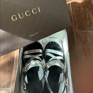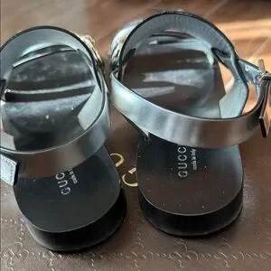 Chic Gucci sandals with metallic silver straps. Features bold design and signature style.