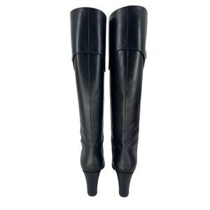 These iconic Gucci Half Morsetto knee-high boots feature supple black leather with beveled almond toes, a gold-tone half horsebit stirrup detail, and a sleek midi block heel. Crafted in Italy, they offer a timeless equestrian silhouette perfect for both elevated everyday wear and chic evening ensembles. The structured shaft hugs the leg for a flattering fit, while the leather sole and luxurious materials highlight Gucci’s heritage of craftsmanship. A highly sought-after wardrobe staple that embodies understated elegance and designer appeal.