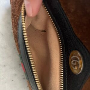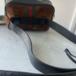 Elegant Gucci bag in brown suede. Features black leather trim. Gold zipper and logo detail. Iconic red and green stripe.