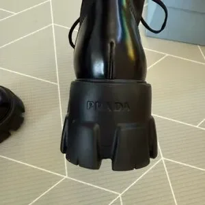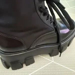 These brushed leather and nylon boots are decorated with a versatile pouch that recalls a multi-pocket design. The formal rigor of the uniform inspires this shoe, an expression of a timeless design, monolithic and unique, that reinterprets the dual soul of Prada from a modernist perspective. The maxi sole that defines the bold lines of Monolith footwear is combined with elegant brushed leather, emphasizing the brand's desire to create harmony through diametrically opposed hybrid concepts.
