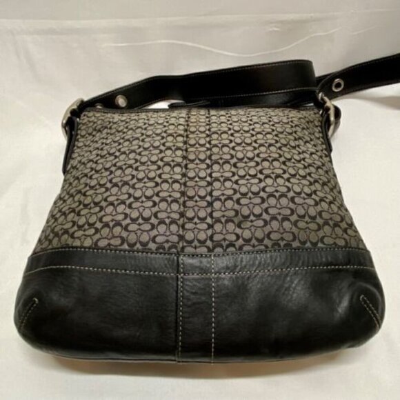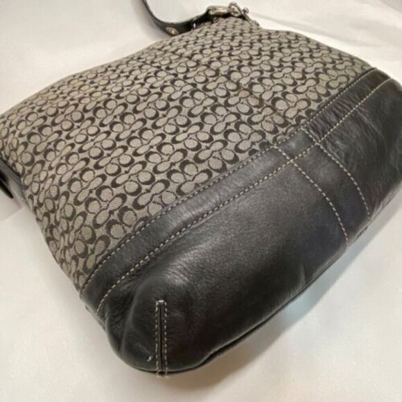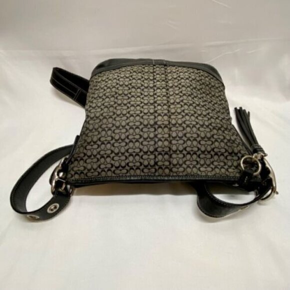 This bag is in good pre-owned condition showing minimal signs of wear. Please see all photos as this is the exact bag you will receive. Signature C design on jaquard fabric with leather trim. The adjustable strap can convert from crossbody to shoulder bag. Zip top closure. Inside liner is clean and features an internal zip pocket and 2 multifunctional slip pockets. Leather tassel on zipper. Dimensions of bag are 10"w, 10"h and 2" deep with the adjustable strap currently set at 20"
