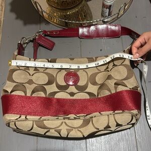 Stylish Coach shoulder bag with bold red accents. Signature canvas design. Perfect for any occasion.