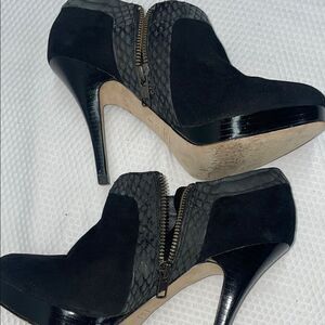 Elegant black ankle booties by Coach. Features a stylish side zipper and textured trim. Perfect for any occasion.