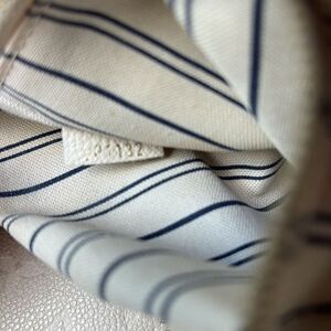 Please look at the pictures. As you see from the pictures, the inside has staining so it needs to be cleaned. The outside also needs to be cleaned and the piping his crackled. This bag needs restoration. Measuring across the bottom of the bag is 13.25 x 10 x 6.5. Measurements are approximate