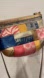Vibrant Coach wristlet with patchwork design. Features gold, pink, blue, yellow, and brown patches. Stylish and compact.