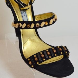 Prada Black Suede Studded Heels (Sandals in Black/Gold Calzature Italian🇮🇹
