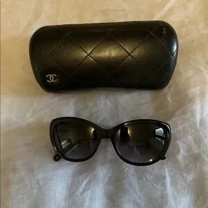 CHANEL black sunglasses with white floral accents on the side. Comes with the original case, authentic. Vintage from ~15 years ago. Great condition.